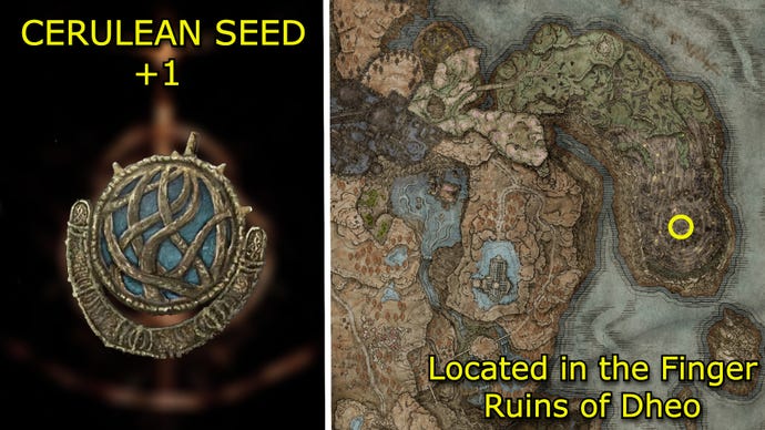 Carry outYmir’s questlineand sound the hanging bell at theFinger Ruins of Dheo. You’ll obtain the Cerulean Seed Talisman +1.