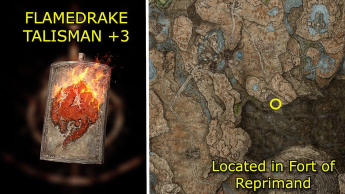 The Flamedrake Talisman +3 is in theFort of Reprimand. From the Fort of Reprimand Site of Grace, go down the stairs into a hallway that’s full of cages. Go to the left to find a platform that you can use to jump over several of the cages, leading to a back part of the room that holds a chest with the Talisman inside.