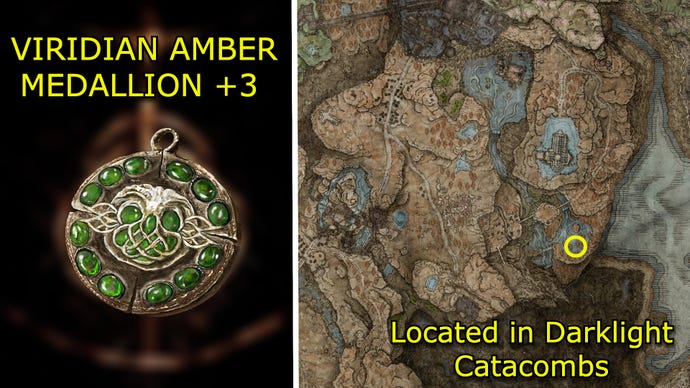 The Viridian Amber Medallion +3 is inDarklight Catacombs, hidden within a chest. After pulling the first lever to illuminate a chasmous stretch of the dungeon, you’l eventually emerge in a room overlooking the chasm. Jump down from the railing onto a narrow ledge, and navigate this ledge until you reach the room with the chest.